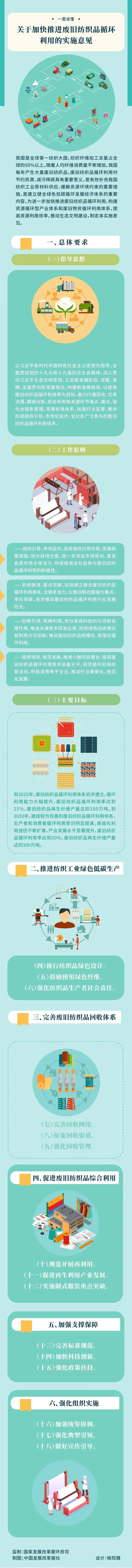 答:《實施意見》聚焦廢舊紡織品生產、回收、綜合利用3個環節,明確了推動廢舊紡織品循環利用的9項具體措施。在推進紡織工業綠色低碳生產方面,提出推行紡織品綠色設計、鼓勵使用綠色纖維、強化紡織品生產者社會責任等3項措施。在完善廢舊紡織品回收體系方面,提出完善回收網絡、拓寬回收渠道、強化回收管理等3項措施。在促進廢舊紡織品綜合利用方面,提出規范開展再利用、促進再生利用產業發展、實施制式服裝重點突破等3項措施。