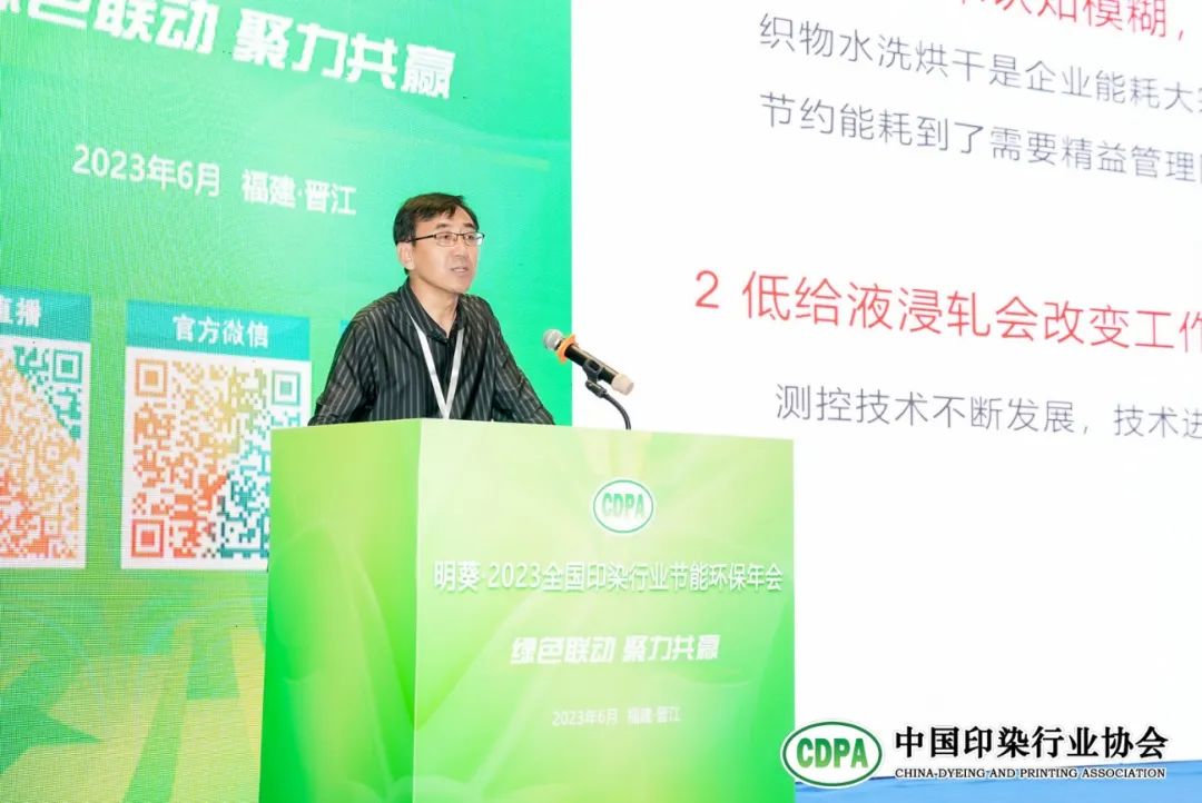 東華大學教授/博導王煒作《印染行業低給液技術的應用》專題報告。王煒指出,與傳統染整工藝相比,低給液量染整技術會顯著降低能耗水耗、減少化學藥劑用量,有助于企業降低能耗、提升產能、降低成本,提高經營利潤。