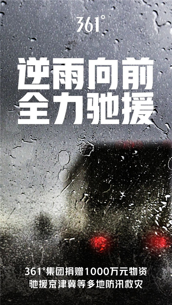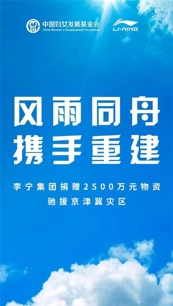 “風(fēng)雨同舟,攜手重建”,中國服裝協(xié)會理事單位——李寧集團(tuán)通過中國婦女發(fā)展基金會捐贈2500萬元物資,用于支持京津冀抗汛救援及災(zāi)后重建工作。 “逆雨向前,全力馳援”,中國服裝協(xié)會理事單位——三六一度集團(tuán)向中國青少年發(fā)展基金會捐贈1000萬元物資馳援京津冀閩等多地災(zāi)區(qū),為一線防汛救災(zāi)工作盡一份力。