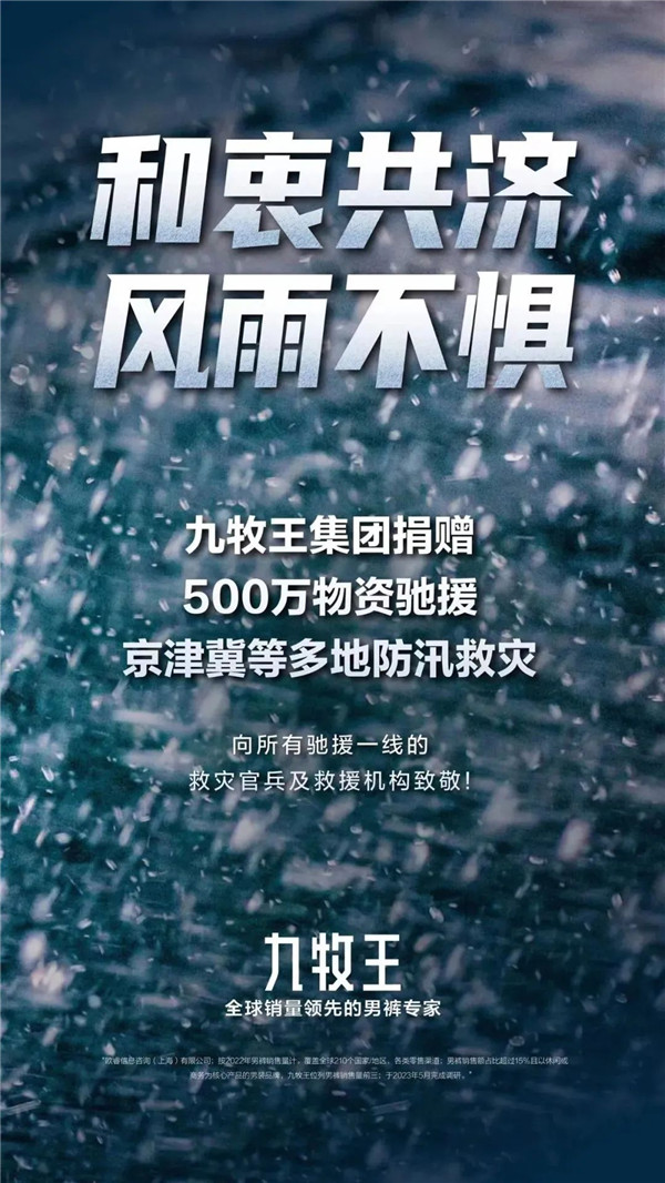 “和衷共濟(jì),風(fēng)雨不懼”,中國服裝協(xié)會副會長單位——九牧王股份有限公司攜旗下品牌九牧王男褲專家、FUN、ZIOZIA緊急捐贈物資500萬元,馳援防汛救災(zāi),用于保障京津冀及泉州等受災(zāi)地區(qū)的人員安全、應(yīng)急救援和災(zāi)后重建等工作。