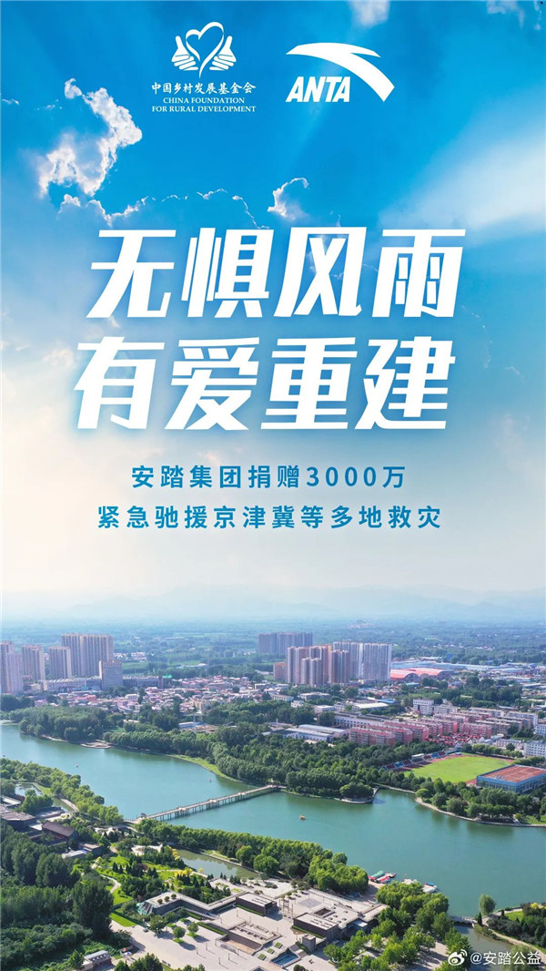 連日來,受臺風(fēng)“杜蘇芮”影響,京津冀多地遭遇持續(xù)強(qiáng)降雨,由此引發(fā)的災(zāi)情及后續(xù)應(yīng)急救援工作備受關(guān)注。在一些救災(zāi)組織積極響應(yīng)投入一線救災(zāi)的同時(shí),多家服裝企業(yè)及電商平臺相關(guān)企業(yè)也第一時(shí)間以不同方式參與到救援當(dāng)中。 “無懼風(fēng)雨,有愛重建”,安踏集團(tuán)向中國鄉(xiāng)村發(fā)展基金會緊急捐贈3000萬元,包括2000萬元物資及1000萬元現(xiàn)金,用于響應(yīng)京津冀及福建泉州受災(zāi)地區(qū)的災(zāi)情救助需求,保障受災(zāi)群眾人身安全和過渡安置,采購緊急救災(zāi)物資和救援設(shè)備,并幫助地區(qū)災(zāi)后重建與復(fù)工復(fù)產(chǎn)。