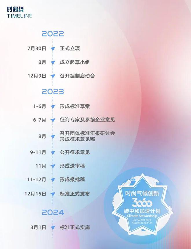 依照工信部《工業(yè)領(lǐng)域碳達峰實施方案》,三項團體標(biāo)準(zhǔn)由中國紡織工業(yè)聯(lián)合會提出,由中國紡織工業(yè)聯(lián)合會標(biāo)準(zhǔn)化技術(shù)委員會歸口。標(biāo)準(zhǔn)自2022年7月起立項,共歷經(jīng)20個月于2023年12月15日完成起草工作和審批,2024年3月實施。在中國紡織工業(yè)聯(lián)合會社會責(zé)任辦公室的組織下,總計22家“時尚品牌30·60碳中和加速計劃”行動企業(yè)和9個分行業(yè)組織分別參與到標(biāo)準(zhǔn)起草工作,起草小組在過程中進行了多輪研究討論及專家咨詢,對重大問題進行審慎研究,最終達成共識形成標(biāo)準(zhǔn)發(fā)布稿。