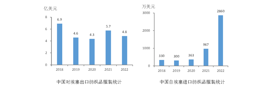 隨著投資合作深入,中埃紡織品服裝貿易往來也日益密切,近年來貿易規模在新冠肺炎疫情沖擊下仍基本保持穩定。根據中國海關數據,2022年中國與埃塞俄比亞紡織品服裝進出口總額達5.1億美元,其中,中國對埃塞出口4.8億美元,主要出口產品包括服裝及衣著附件(1.8億美元,占比37.5%)、化纖長絲及織物(1.1億美元,占比22.9%)、針織物及鉤編織物(占比10.4%)等。中國自埃塞進口紡織品服裝規模較小,僅為中國對埃塞出口紡織品服裝規模的6%左右,但近年來保持較快增勢,2022年中國自埃塞進口紡織品服裝金額約為2860萬美元,其中天然纖維及制品進口規模是絕對主體,棉花、麻、羊毛紗及織物等天然纖維原料及制品合計占進口總額的比重達90%以上。