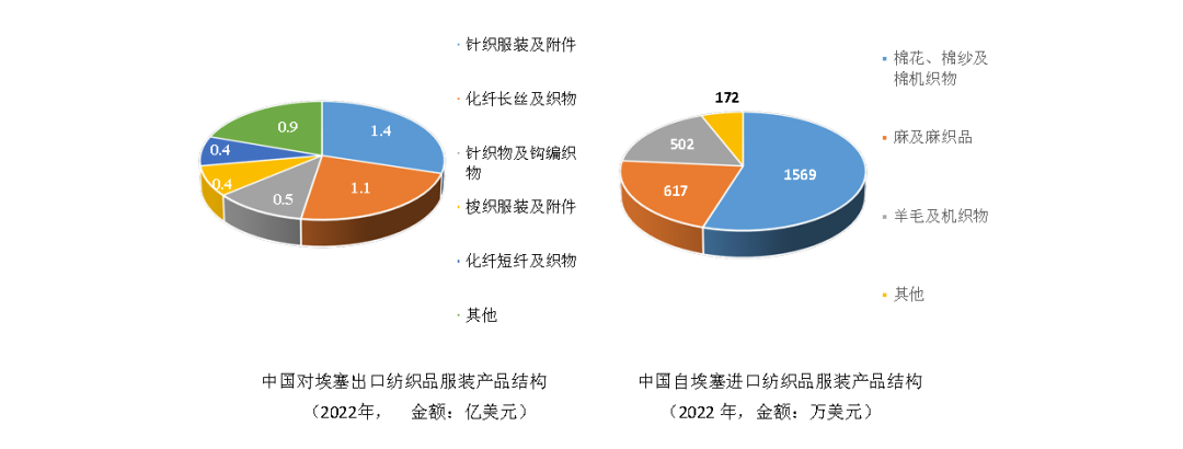 2022年,埃塞自全球進口紡織品服裝金額為6.5億美元,其中化纖長絲及織物(2.9億美元,占比44.5%)、梭織服裝及附件(占比14.4%)等是主要進口大類產品。中國是埃塞最大的紡織品服裝進口來源國,2021年埃塞自中國進口纖維原料、紡織品服裝金額共4.4億美元,占比達到78%;此外印度(占比6.9%)、土耳其(占比3.1%)、巴基斯坦(占比2.2%)也是埃塞主要紡織品服裝進口來源國。