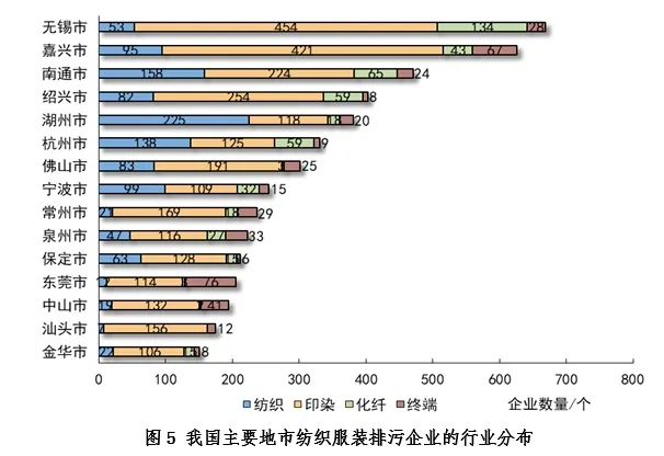 從主要地市排污企業(yè)數(shù)量和結(jié)構(gòu)看,蘇州市紡織、印染、化纖和終端行業(yè)排污單位數(shù)量為2,005家、755家、143家和64家,除終端行業(yè)外均居地級市首位并遠(yuǎn)多于其他地市。除蘇州外,主要15個發(fā)達(dá)地市排污企業(yè)數(shù)量在150-670家之間。15個城市中,湖州和杭州以紡織類排污企業(yè)居多。其他地市則以印染為主,企業(yè)數(shù)量占比多數(shù)超過50%,其中汕頭市印染企業(yè)占比最高,達(dá)到89.1%,見圖5。