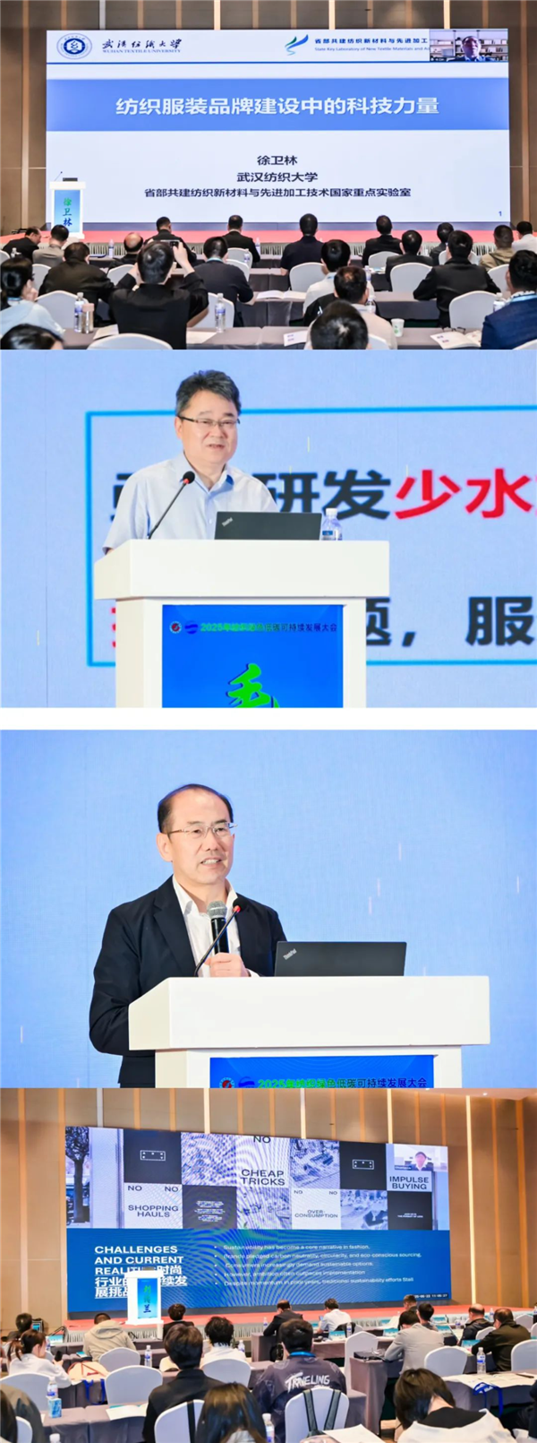 武漢紡織大學徐衛林院士、東華大學毛志平教授、青島大學房寬峻教授、路易斯安那大學劉傳蘭教授分別為大會作了精彩主旨報告。徐衛林的線上報告以“科技力量在紡織服裝品牌建設中的作用”為核心,從纖維材料創新、紡紗技術革新、織物后整理與標準檢測三個維度展開,指出科技創新是提升品牌核心競爭力的關鍵要素。并結合國內外典型案例,分析了科技創新推動品牌價值提升的路徑,強調我國制造企業需深化產學研協同創新,將科技研發成果轉化為品牌差異化優勢,為提升中國紡織服裝行業的國際影響力注入新動能。毛志平圍繞聚酯纖維筒子紗超臨界CO2無水染色技術,分享了其團隊在ScCO2流體染色三大關鍵問題:染料溶解行為調控方法,高效率上染工藝、染色成套裝備等方面取得的研究成果,并介紹了其工程化生產產品質量與節能減排效果,從源頭上解決印染行業的淡水資源消耗和廢水排放問題。房寬峻介紹了開發的活性染料無鹽連續軋染和濕態高速噴墨印花技術,通過對染整過程中分子作用機制的研究,為開發原創性印染技術指出了新思路。劉傳蘭針對當前紡織行業面臨的綠色挑戰,借助學術研究與實際案例闡述了數字化技術對時尚行業可持續發展的推動作用,呼吁我國紡織行業應緊抓機遇,引領全球可持續時尚轉型。