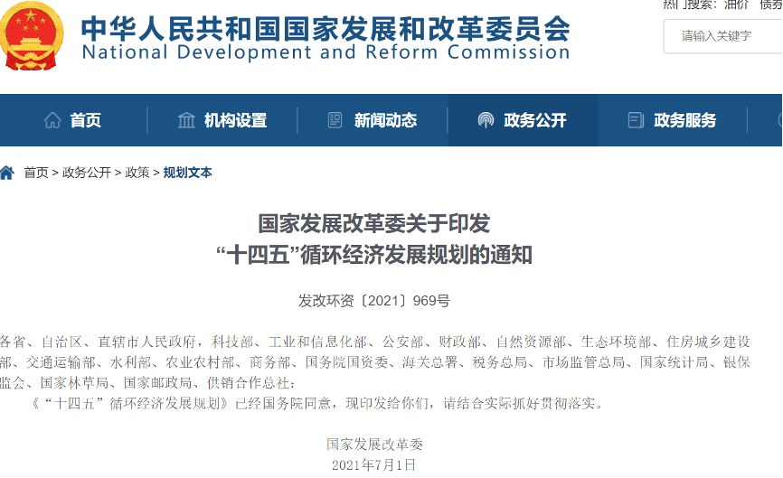 日前,國家發(fā)展改革委印發(fā)《“十四五”循環(huán)經(jīng)濟(jì)發(fā)展規(guī)劃》