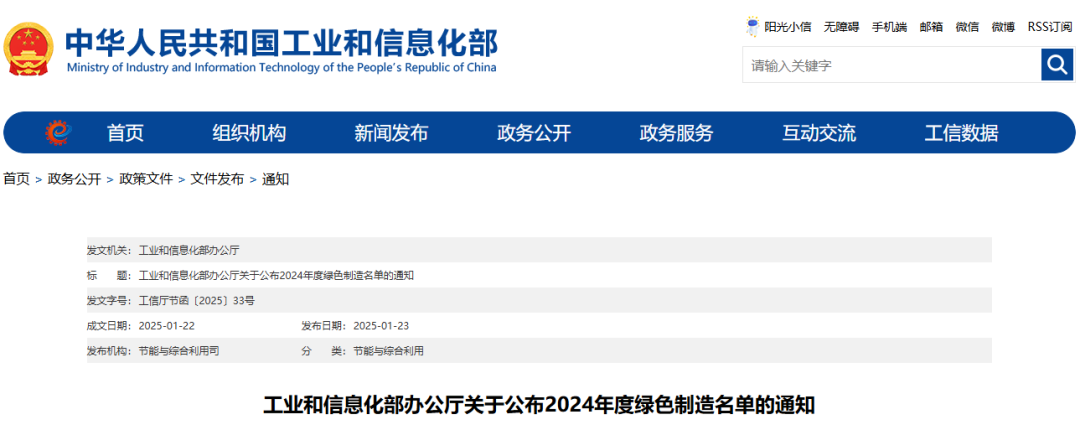 1月23日,工業和信息化部網站公布了 2024 年度綠色制造名單。