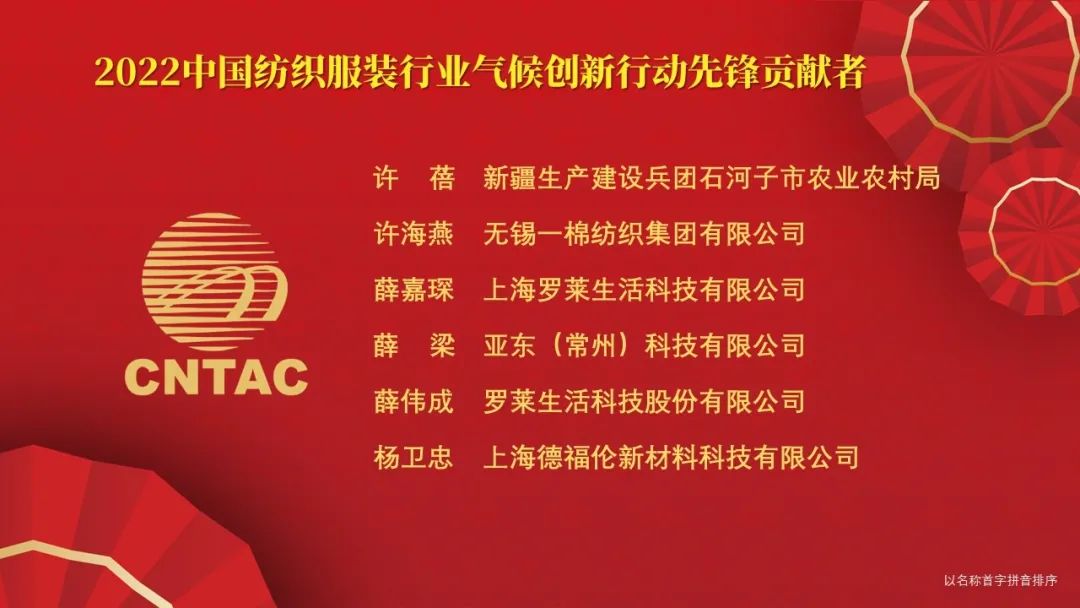 在12月29日舉行的2022年中國紡織大會上,中國紡織工業(yè)聯合會對55家“中國紡織服裝行業(yè)氣候創(chuàng)新行動先鋒單位”和65位“中國紡織服裝行業(yè)氣候創(chuàng)新行動先鋒貢獻者”進行了通報表揚。