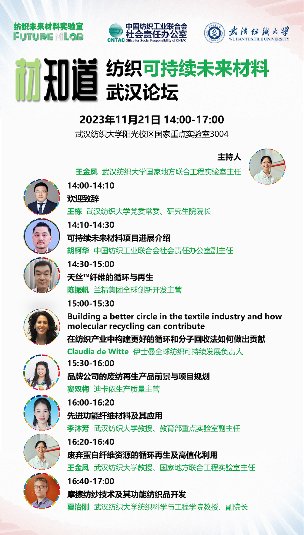 為此,中國(guó)紡織工業(yè)聯(lián)合會(huì)社會(huì)責(zé)任辦公室、中國(guó)紡織信息中心在蘭精集團(tuán)和伊士曼集團(tuán)的支持下開(kāi)展調(diào)研和交流活動(dòng),2023年11月21日在武漢紡織大學(xué)舉辦學(xué)術(shù)研討會(huì),研討主題“紡織行業(yè)可持續(xù)未來(lái)材料”。重點(diǎn)圍繞綠色可持續(xù)紡織材料的發(fā)展方向,預(yù)測(cè)未來(lái)(10年以后)紡織領(lǐng)域中具備大規(guī)模產(chǎn)業(yè)化應(yīng)用前景的可持續(xù)材料,該類材料對(duì)生態(tài)、生物以及環(huán)境的負(fù)面影響可降低到最小化,并從綠色、時(shí)尚與科技三個(gè)維度同步對(duì)該類材料展開(kāi)熱烈討論。
