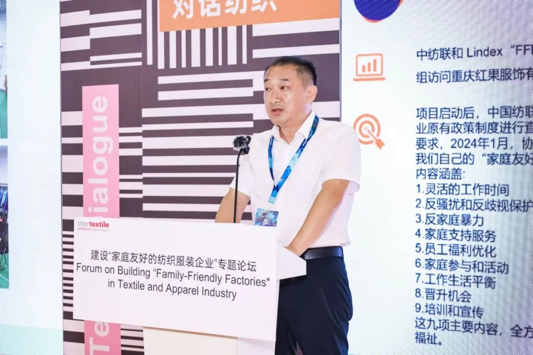 中華全國總工會一級巡視員王雙清通過視頻全面闡述了工會在推動家庭友好型紡織服裝企業建設中的積極作用,他指出工會自2021年積極投身建設,編制指導手冊,2023年聯合多部門開展典型案例征集活動,推出了100個家庭友好型工作場所典范。他表示鑒于紡織業人才短缺,特別是女職工就業壓力,推廣家庭友好項目迫在眉睫。